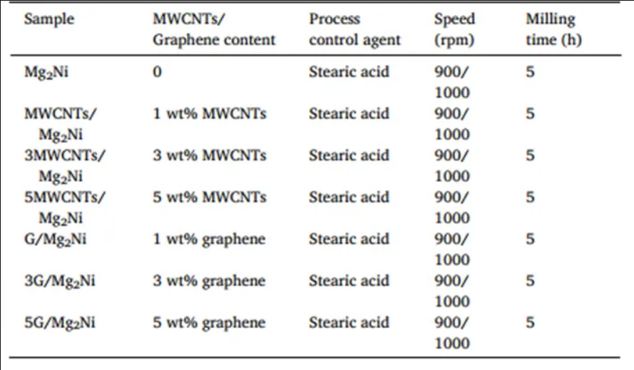 首先稱取45.3g鎂粉、54.7g鎳粉和3g硬脂酸(用作過(guò)程控制劑)。為了平衡Mg在球磨過(guò)程中的損失,額外添加4wt %的Mg,然后均勻混合并放入高能球磨機(jī)中。為了防止球磨過(guò)程中的氧化,在氬氣保護(hù)氣氛下進(jìn)行了研磨。球料比為15∶1,采用3mm不銹鋼球,球磨機(jī)以900r/min和1000r/min的速度交替運(yùn)行,研磨時(shí)間為5h。在球磨過(guò)程中使用循環(huán)冷卻方式,使球磨腔溫度維持在35℃左右。使用石墨烯和MWCNTs對(duì)Mg2Ni合金進(jìn)行復(fù)合改性。