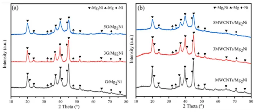 圖1(b)顯示了MWCNTs的XRD圖,Mg2Ni的特征峰在2θ=20°、2θ=40°和2θ=45°處清晰可見(jiàn),與MWCNTs的添加量無(wú)關(guān)。由于MWCNTs以非常少的量存在,因此沒(méi)有檢測(cè)到它們的特征峰,Mg2Ni仍然是主要相,存在極少量的Mg和Ni相。因?yàn)?/span>Mg具有較高的吸氫量,這也是在后續(xù)研究中實(shí)際吸氫量略微超過(guò)理論容量的原因。圖1(a)給出了球磨后石墨烯復(fù)合樣品的XRD圖譜。與MWCNTs類似,由于其含量較少,不能發(fā)現(xiàn)明顯的石墨烯峰。初生相仍為Mg2Ni,僅存在微弱的Mg和Ni特征峰。