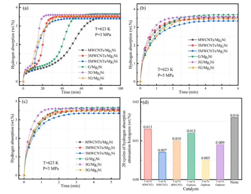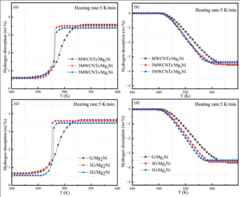 當(dāng)添加量為3wt%時(shí)表現(xiàn)出最佳的吸氫性能,在475K的溫度下,在200s內(nèi)迅速達(dá)到吸氫的飽和狀態(tài),在達(dá)到吸收溫度后表現(xiàn)出穩(wěn)健的吸氫動(dòng)力學(xué)。隨著5wt%MWCNTs的引入,放氫飽和溫度為545K,放氫速率也略有上升。與MWCNTs樣品相比,3G/Mg2Ni在476K左右表現(xiàn)出更冷的吸氫量,具有更強(qiáng)的動(dòng)力學(xué)特性,可以在150s內(nèi)快速達(dá)到吸氫飽和。