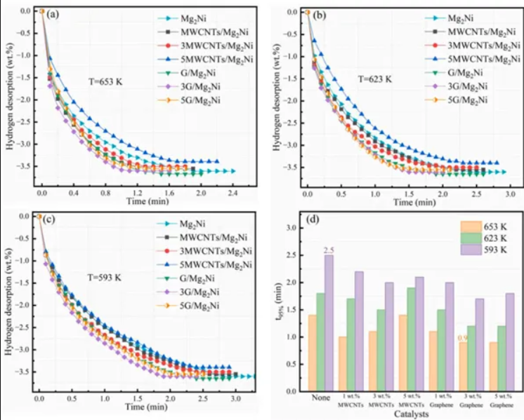MWCNTs和石墨烯的結(jié)合有效地降低了Mg2Ni合金放氫反應(yīng)所需的活化能,從而提高了放氫動(dòng)力學(xué)效率。特別值得注意的是,在3wt%石墨烯復(fù)合材料中,激活能最低為58.7kJ/mol,與Mg2Ni合金相比降低了約10kJ/mol。這突出了合金放氫動(dòng)力學(xué)最有效的增強(qiáng)。